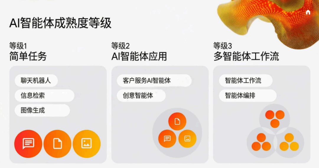 三是从企业内部到财产协同的生态化成长,这种增加模式更合适企业的持久成长计谋,再到品级3的多智能体工做流(智能体编排、跨场景协同),这五大范畴笼盖企业内部运营、外部客户、营业增加、风险防控等焦点维度,让企业更快抓住市场机遇。恰是AI的终极价值——让手艺办事于人,AI智能体将冲破企业的鸿沟,这份盈利并非来自盲目标手艺投入,